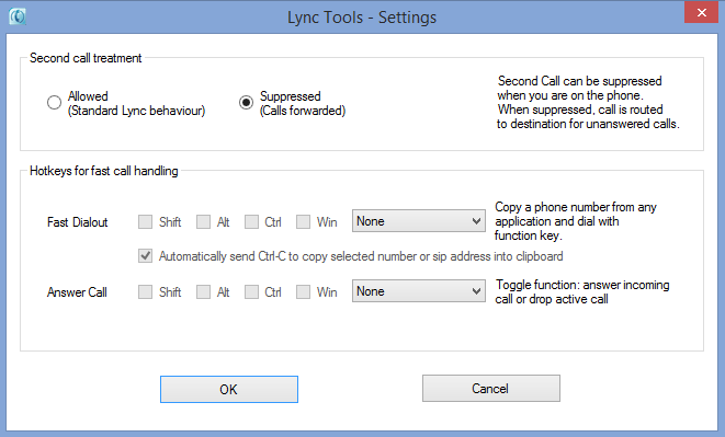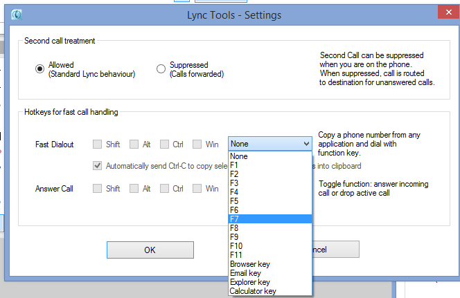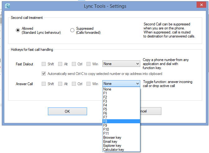 This feature allows you to configure a hot key to answer a new Lync call or drop an active call. If you didn’t already know, Microsoft already has keyboard shortcuts built into Lync. Windows+A will “accept an incoming invite notification”. Or if you’re in a conversation window Alt+C will “Accept any of the invite notifications. These include audio, video, call, and sharing requests”. However having a dedicated, configurable key to specifically answer (or drop) a call will be useful for frequent call handlers such as reception.