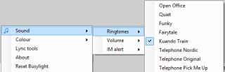You can change Sound settings – yes the device has a built in speaker! You can set ringtones for IM Alerts. Rather than making a sound on your desktop speakers (if you have any) it uses the built in speaker at the base of the device. This speaker has an independent volume control through the tray app itself.