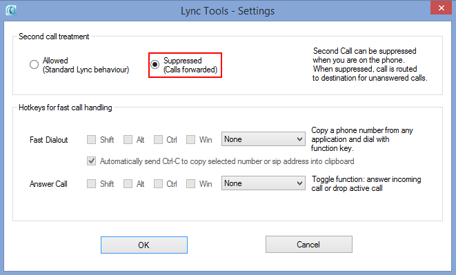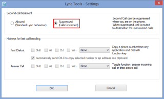 Choose “Suppressed” to redirect a second call to the destination for unanswered calls (as defined in your Lync client). So rather than hear call waiting and allowing the user to finish one call and answer another, this allows you to immediately offload the call to your chosen unanswered calls destination, such as voicemail.