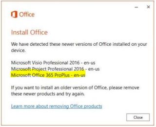 I clicked install and a warning popped up stating that “We have detected these newer versions of Office installed on your device.” and my only choice was to close.