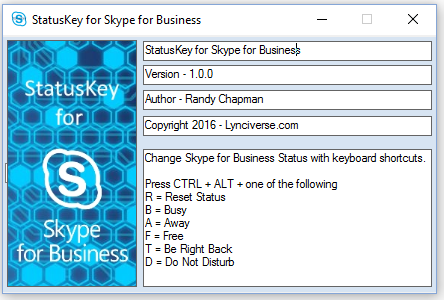 StatusKey is a tray application that allows you to change your Lync and Skype for Business presence status using keyboard shortcuts. I know you can set your status in the Skype for Business client itself, but really that just takes too many mouse clicks. If application development is good for anything it is for time savings. Rather than hunting for the client on the task bar full of other stuff or right clicking the (probably) hidden system tray icon and opening the menu to set your status, just hit the appropriate hot keys and you’re set.