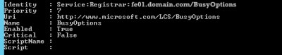New-CsServerApplication -Identity ‘Service:Registrar:fe01.domain.com/BusyOptions’ -Uri http://www.microsoft.com/LCS/BusyOptions -Critical $False -Enabled $True -Priority (Get-CsServerApplication -Identity ‘Service:Registrar:fe01.domain.com/UserServices’).Priority