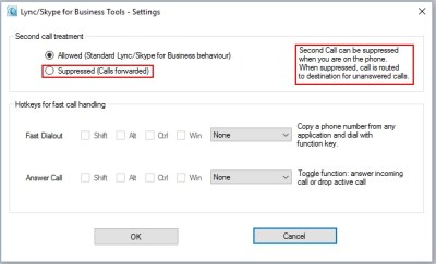 One I like comes with a device I like. The Kuando Busylight. I have two of them, the Alpha and Omega and both come with a tray app that lets the user choose what happens to a second call, allowed or forwarded. As you can see from the image below it explains that if suppressed is chosen the second call is routed to your unanswered calls destination. So this isn’t the same as busy/engaged on busy. But it does give you second call treatment nonetheless.