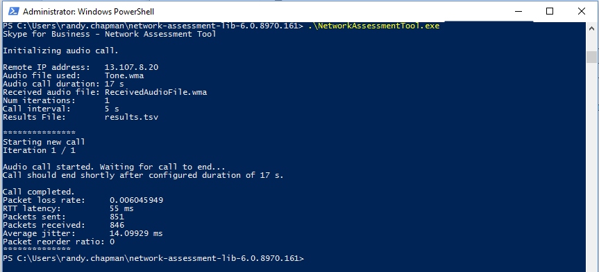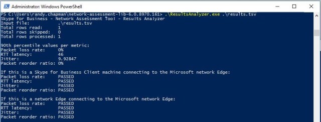 This is a very basic tool that runs in either the command prompt or PowerShell with elevated privileges. The tool is designed to test the network performance between your laptop/PC and the Skype for Business Online Network Edge. It checks for latency, packet loss and jitter (all of the things that might make a call using Skype for Business Online terrible).