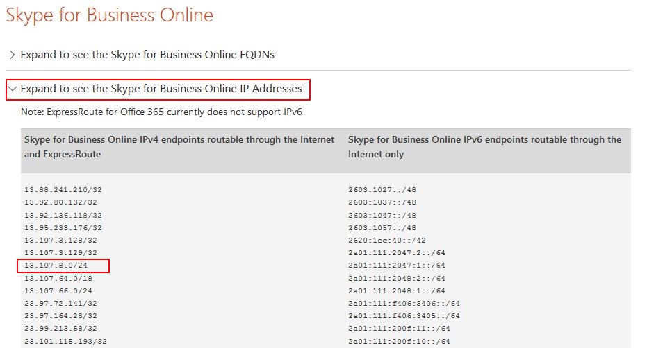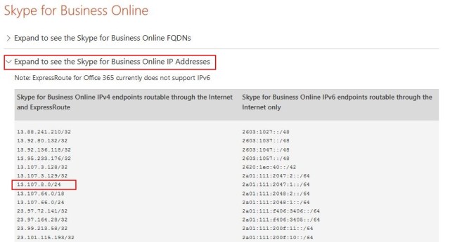 The one key I questioned was the Relay.IP, which is 13.107.8.20. I was curious to see what this is so I did a search to find the Skype for Business Online IP addresses. And I found a big list here – https://support.office.com/en-us/article/Office-365-URLs-and-IP-address-ranges-8548a211-3fe7-47cb-abb1-355ea5aa88a2#BKMK_LYO. And sure enough, this IP is part of a range. A quick check on the IP tells me it belongs to Microsoft Azure and lives in Redmond. So I left it alone.