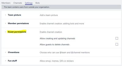Click on the menu (3 dots) -> view team -> Settings ->@ expand Guest permissions.