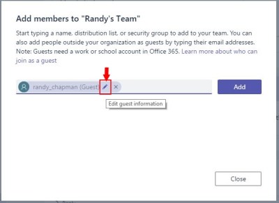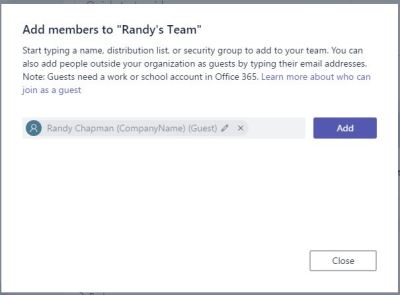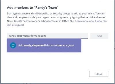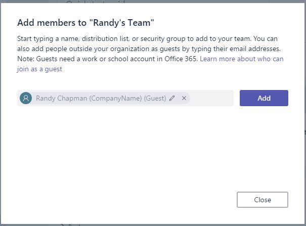 Once you’ve enabled your tenant for Teams Guest access and all that, you can add a member as normal by typing in the email address of the guest.