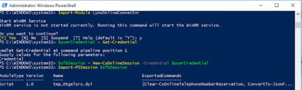 Import-Module SkypeOnlineConnector $userCredential = Get-Credential $sfbSessionNew-CsOnlineSession -Credential $userCredential Import-PSSession $sfbSession