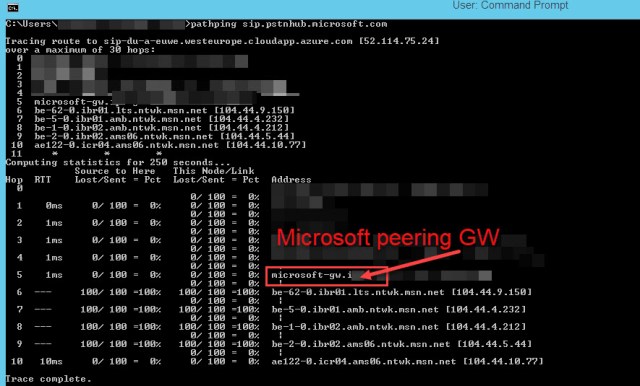If you want to know how many hops you have, I recommend doing a pathping to sip.pstnhub.microsoft.com and see for yourself. Pathping shows you all of the hops, the RTT for each hop and the combined RTT for the final destination. My lab server has a combined RTT of 10ms to get to the primary connection point even though it had 4 hops just to get to the Microsoft edge. So not so bad.