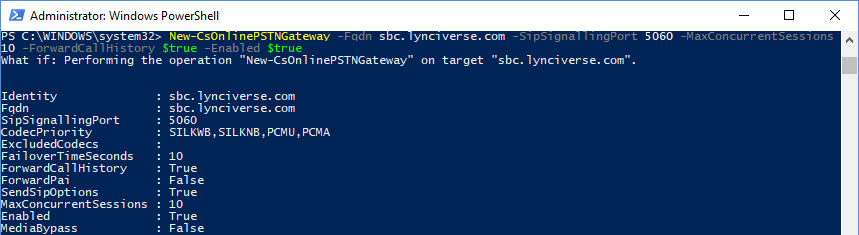 New-CsOnlinePSTNGateway -Fqdn sbc.domain.com -SipSignallingPort 5060 -MaxConcurrentSessions 10 -ForwardCallHistory $true -Enabled $true