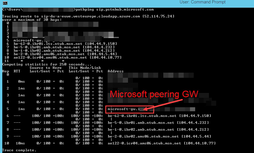 If you want to know how many hops you have, I recommend doing a pathping to sip.pstnhub.microsoft.com and see for yourself. Pathping shows you all of the hops, the RTT for each hop and the combined RTT for the final destination. My lab server has a combined RTT of 10ms to get to the primary connection point even though it had 4 hops just to get to the Microsoft edge. So not so bad.