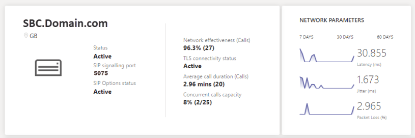 This shows you some of the same basic information from the standard view, as well as its location and some configuration information like the SIP signalling port. Additionally, it shows a few metrics for the network performance for the last 7, 30 or 60 days.