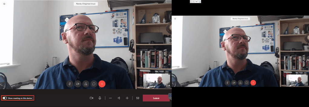 On the left is the touch screen with meeting controls. On the right is the in-room display, also with meeting controls. And yes, the meeting controls work (assuming you have a touch screen).
