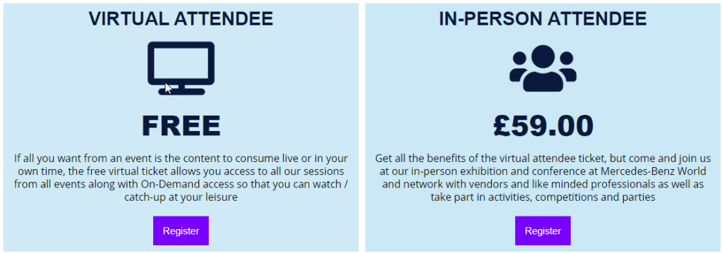 We will have over 40 in-person exhibitors and some virtual only sponsors. We have 5 session rooms with 65 sessions over two themed days from around 50 speakers. This means if you can’t make both days because of work committments you can choose which day suits you and your situation.