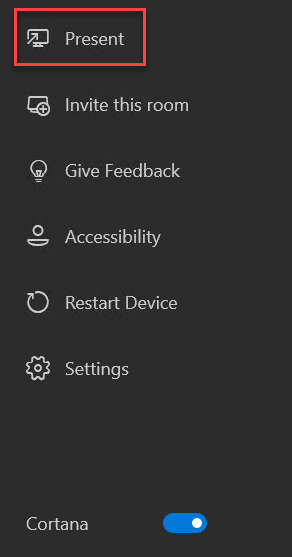 As it says here, if you set the parameter to disabled, it completely disables Cortana and puts the Present button back on the main screen. This means you have no push-to-talk in an idle state or in meetings. And it also means there’s no wake word detection. Cortana is just disabled.