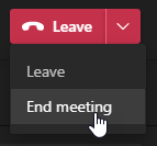Now when you’re ready to finish your casting session you need to make sure you End the meeting. If you click leave, your Teams desktop casting session will leave the meeting, but the MTR will stay in it. Use the drop down box next to leave and select End meeting.