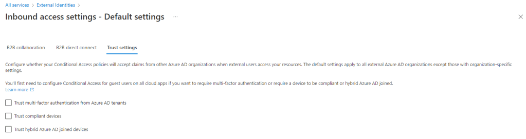 You can also make changed to trust settings if you want to trust multi-factor authentication, compliant devices, or hybrid Azure AD joined devices from other organizations. I’ve kept it high level here. But configure what you want here.