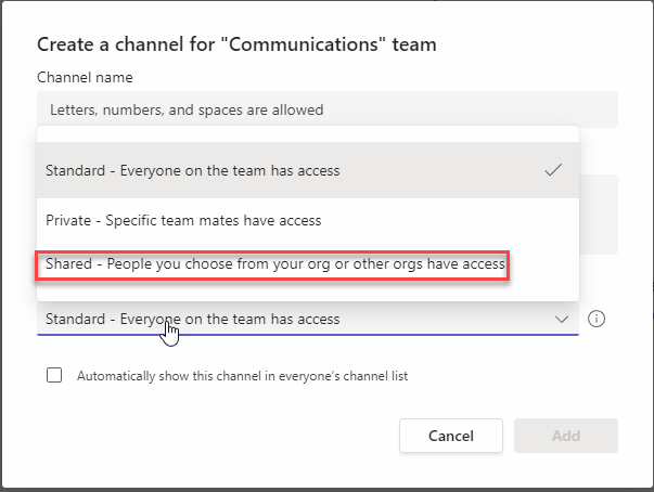 - Create a shared channel in Teams