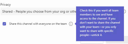 There’s also a tick box underneath which allows you to share the new shared channel with all of the members of the team itself.