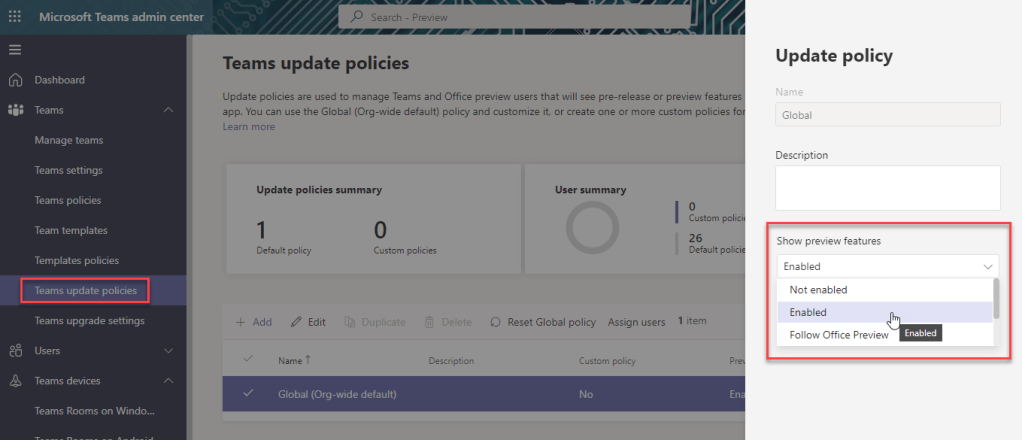 First, Shared Channels is in public preview. So if you want to use it, go join that first. Get your admin to modify the Teams update policy to allow preview features. Set the update policy to Enabled to show preview features. Either modify the global one or create and assign a new one so that select users can choose to join public preview.