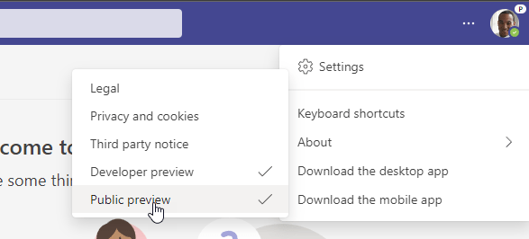 Now once the update policy is updated, in the Teams client for web or desktop, click on the … and under about, click Public Preview.