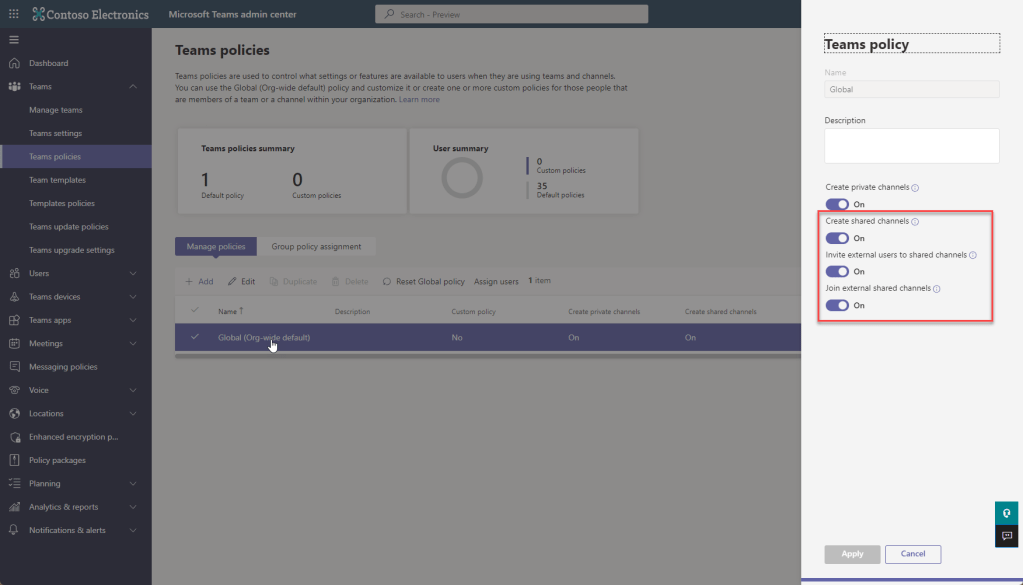 - Create shared channels is as it says, it allows users to create the shared channels in the first place. I think if you are going to be restrictive and selective, do it here. If you don’t want every user to be able to create a new shared channel, create a new policy with just that enabled, and disable it in global.