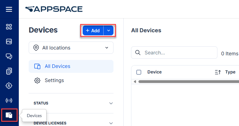 To add an MTR device open up your Appspace cloud portal and click on devices