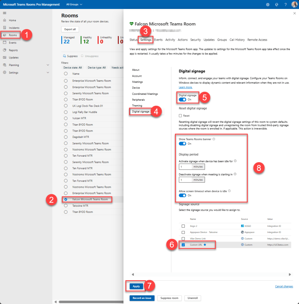 If you have permissions, start in the PMP here https://portal.rooms.microsoft.com/ and expand Settings and click on Digital Signage