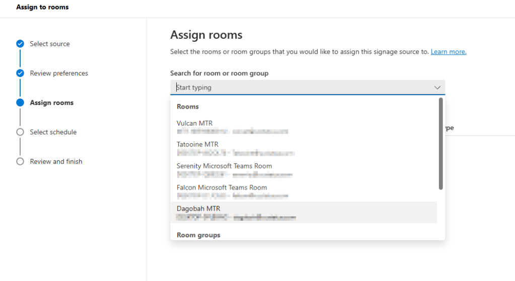 Now to select the rooms. You can type to search and add multiple rooms. Or use the drop down to select a room from the list if you don’t have that many rooms