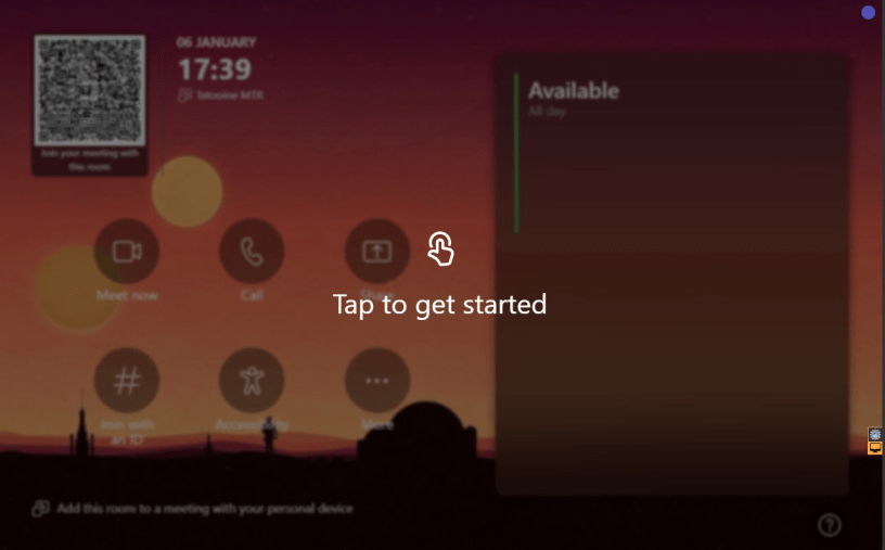 The cool thing is the touch console gets a pulsing overlay to Tap to get started. The Front of room display shows the content along with a Teams room banner if you have chosen to show that.