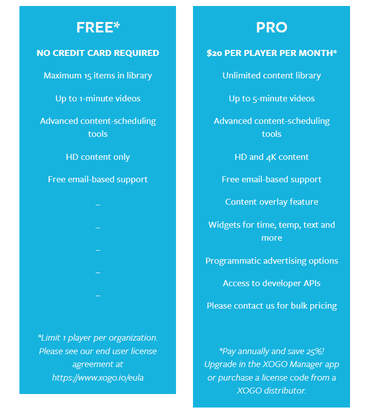 Pricing is listed on their site XOGO Digital Signage Pricing. They offer a Freemium service with support for a single player and a limited feature set. I’ve been playing with the Pro featureset as part of my trial.