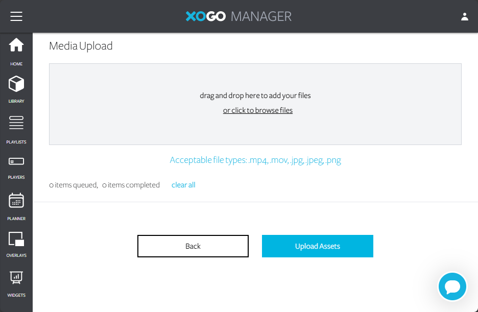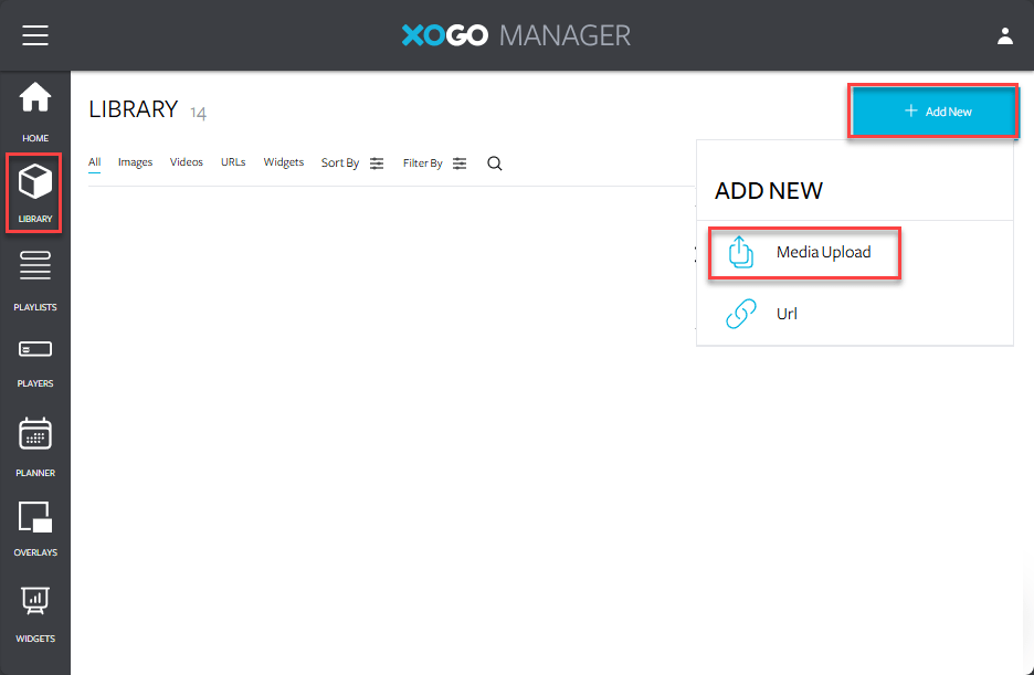 You need to create Playlists to use as signage on your Teams Rooms. First though you need to upload assets to your library. In Manager go to Library and click add new and media upload.