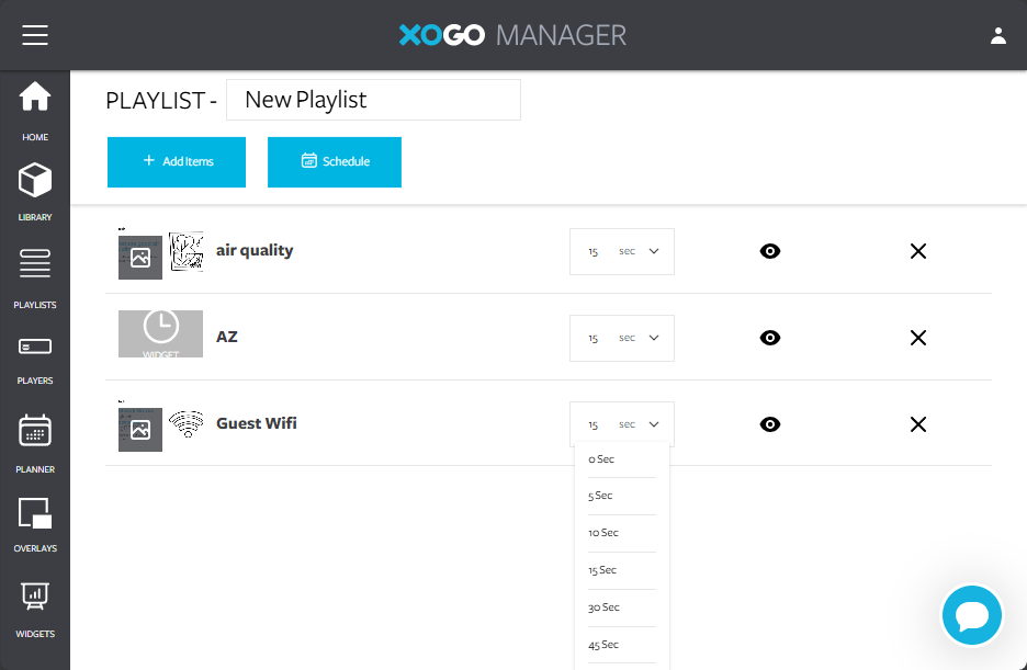 This creates the playlist. From the next screen you can make assets visible or hidden, remove them, or adjust how long to show them while the playlist plays.