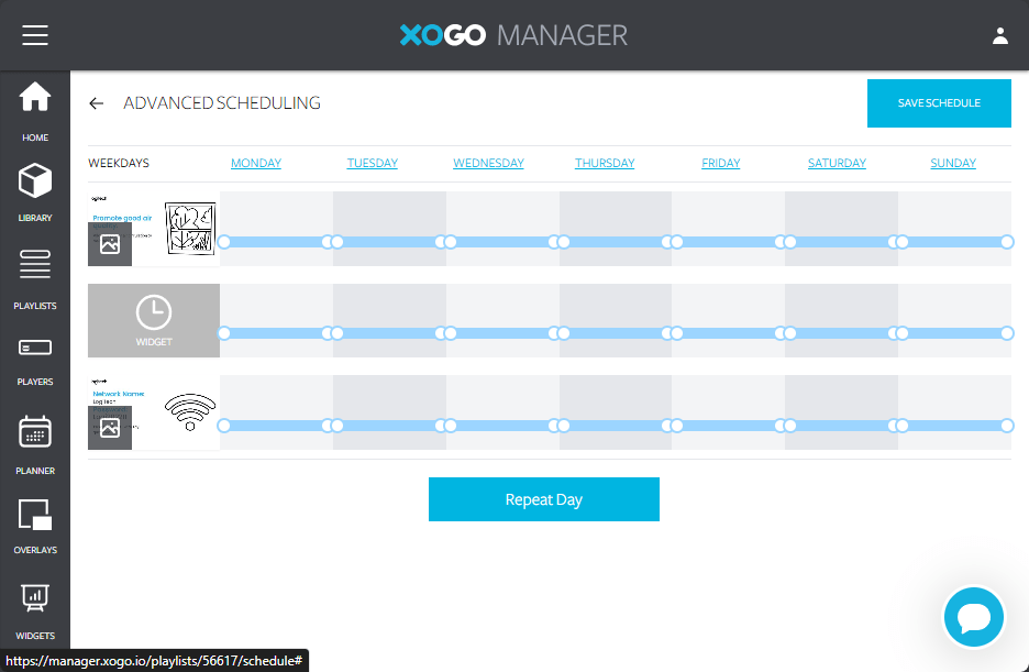 After this you can add scheduling for each asset in the playlist. For instance, you might want a specific asset to only play first thing in the morning or only on Friday. When you’re done hit save schedule, or go back