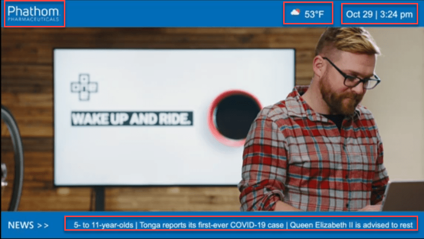 Additionally you can add overlays which can be as simple as your logo in the corner over a background or more complex with web services pulling time and date, news feeds and weather from external sources, and arranging them on a page.