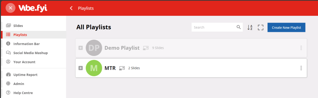 A playlist is a list of slides to use as the digital signage content on your player. In this case an MTR. Click on Create new playlist and give it a name. I created a playlist called MTR. The stuff on the left is all of the content that’s there to start with, plus any slides you added. There are different content types from programs and infotainment and simple photocards.